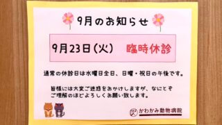 皆さま、こんにちは😊本日は、10月の臨時休診日をお知らせ致します。🍀10月25日(土) 午前のみ休診午後の診療は通常通り行っております。※午前中もお薬・フードのお渡しや診察なしの爪切りは実施しております。事前にご連絡をお願いいたします。皆様...
