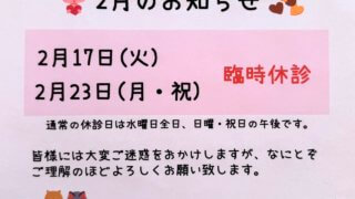 皆さまこんにちは😊本日は、2月の臨時休診日をお知らせいたします。🍀2月17日(火) 臨時休診🍀2月23日(月・祝) 臨時休診皆さまには大変ご迷惑をおかけしますが、何とぞご理解のほどよろしくお願いいたします🙇‍♀️